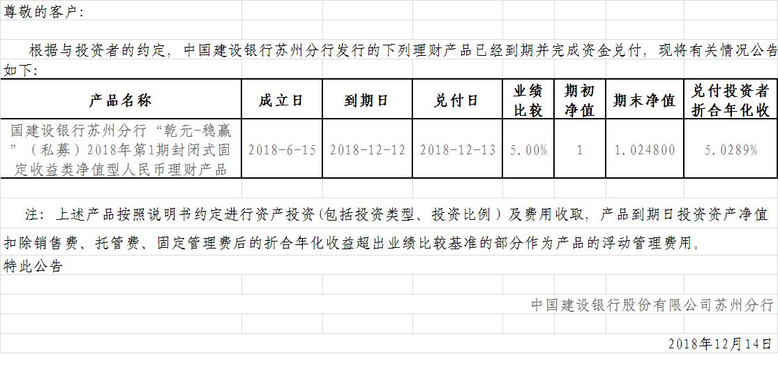 中国建设银行苏州分行“乾元-稳赢”(私募)2018年第1期封闭式固定收益类净值型人民币理财产品兑付公告