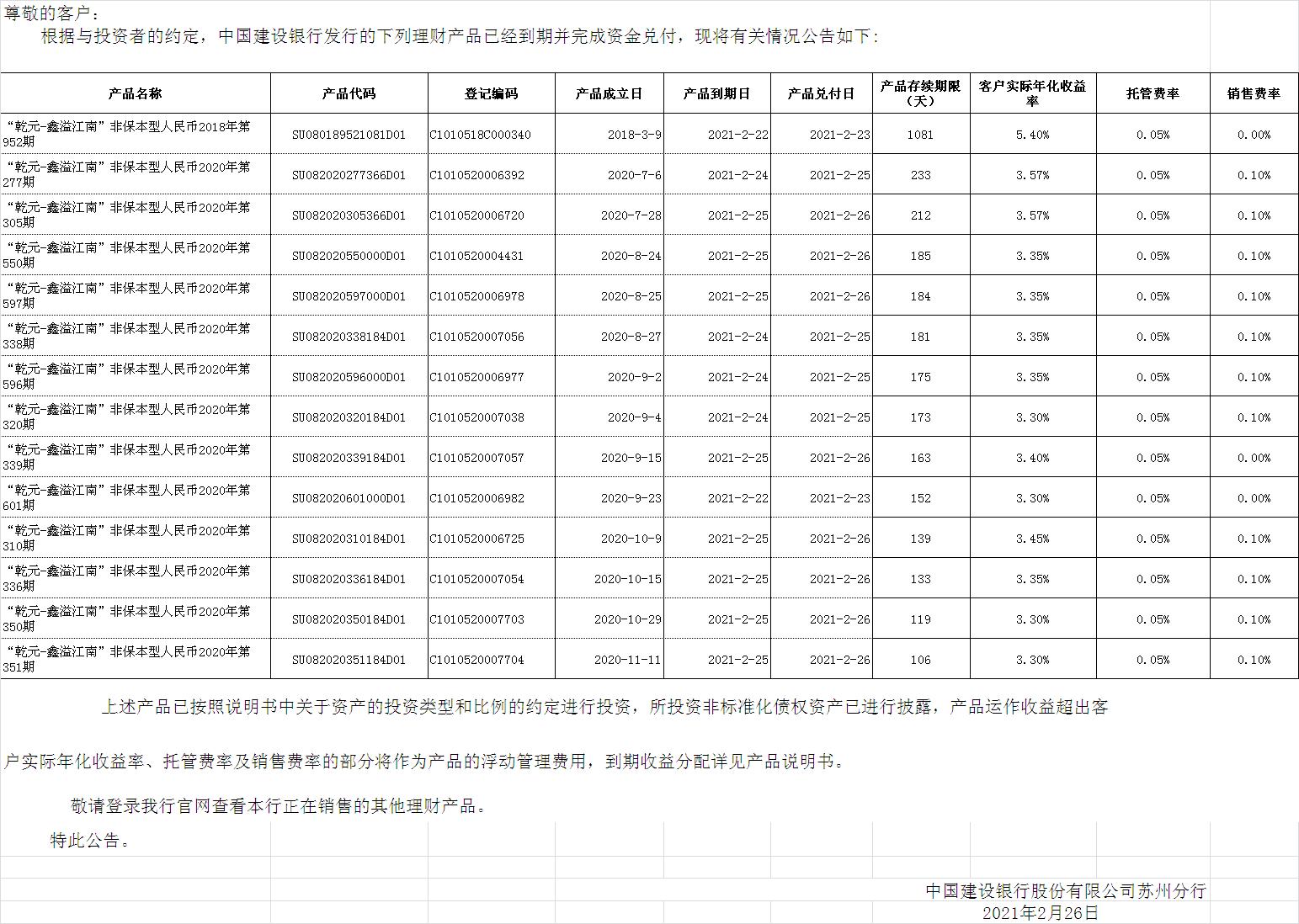 中国建设银行理财产品终止及清算公告
